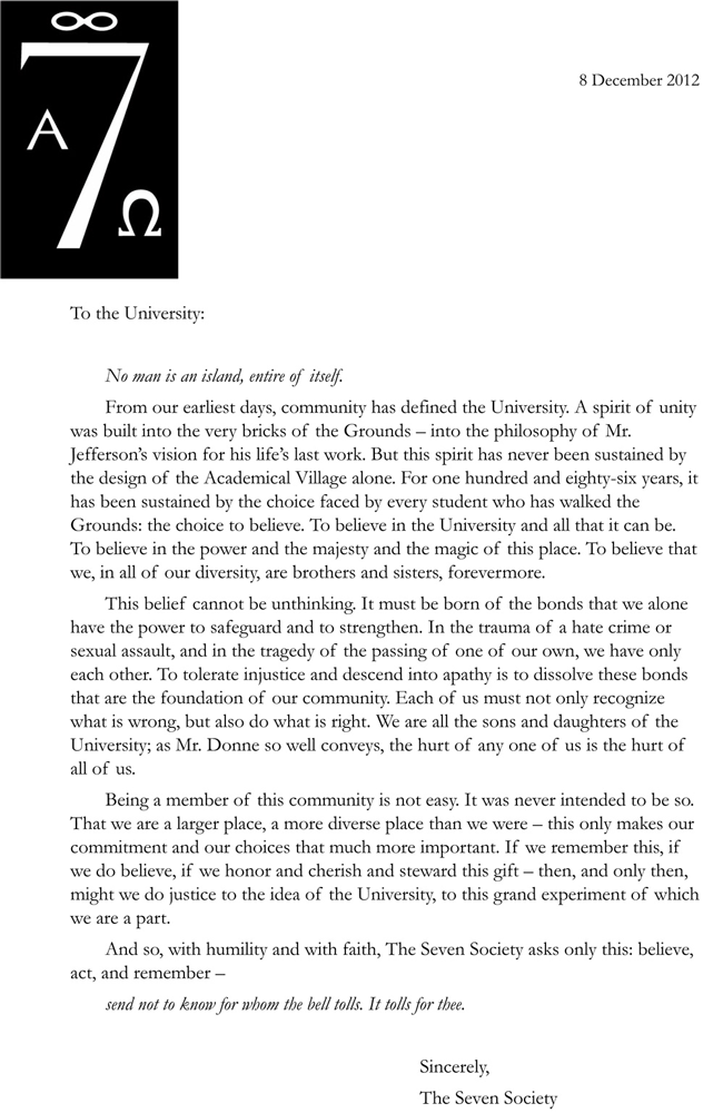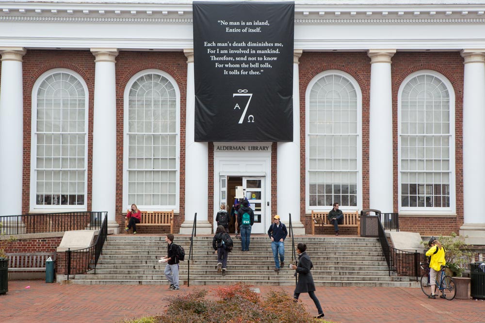 Just before sunset on a December evening near the end of the fall semester, seven large, identical banners were raised on seven buildings around Grounds. Accompanied by a letter to the University community from the Seven Society, one of UVA’s oldest secret societies, the banners featured a quotation from English poet John Donne that touches on accountability and the interconnectedness of all people.