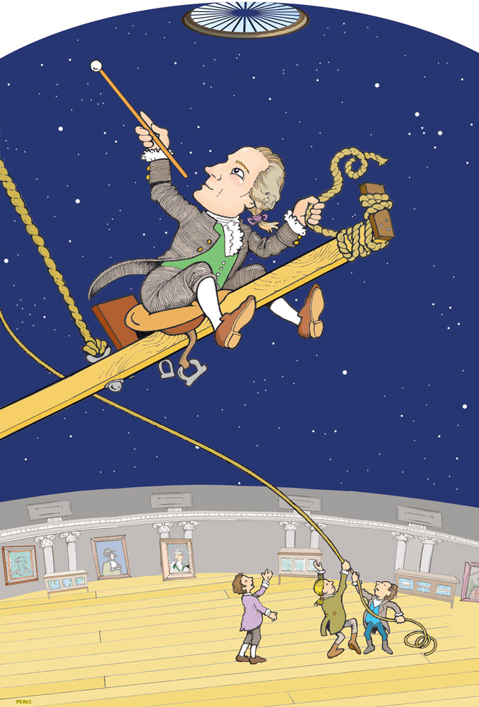 As UVA embarks on the Rotunda’s current renovation project, this may be a timely opportunity to explore creative ways to celebrate Jefferson’s astronomical intentions. One can easily envision a Dome Room digital sky show, using the astronomy department’s portable planetarium, depicting the known universe of the early 19th century. Or perhaps the architectural history and engineering departments could collaborate on a working model of the hoisting mechanism and celestial ceiling Jefferson envisioned. As his expansive notes reveal, the sky was never a limit in Jefferson’s thinking.