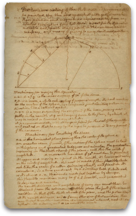 During the summer of 1818, 75-year-old Thomas Jefferson composed two remarkable pages of notes concerning his soon-to-be-constructed University of Virginia. At the center of his Academical Village, he envisioned a Rotunda dome room that would serve not as a library—as it would in the years after its construction—but as a planetarium for teaching astronomy, which he deemed the most important of the eight natural philosophies in his university curriculum. The dome’s interior surface would be painted a vivid sky blue and be arrayed with constellations of gilded stars in the shape of half-spheres. Each star would be fixed to the dome’s surface according to the most accurate celestial coordinates known to the best astronomers of the time. Jefferson envisioned that the dome’s "concave" would serve as an oversized star chart to support this noble exercise in celestial cartography and be an integral part of the astronomy class lectures.