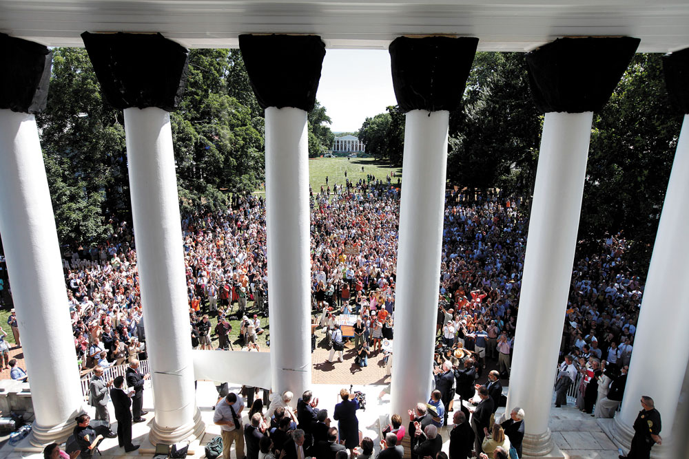 Sullivan recalled for us what it was like that moment in University history when she, as the just-reinstated president, emerged from the Lawn side of the Rotunda to address the cheering community. She focused on her text, not the crowd, she told us, and on the job that lay ahead, not the intrigues just past.