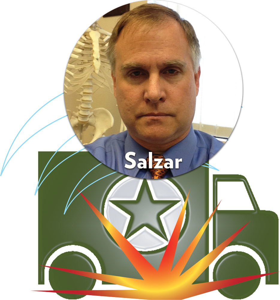 When soldiers in armored Humvees were being killed and injured in high numbers by IEDs during the Iraq War, the Pentagon introduced the Mine Resistant Ambush Protected vehicle, or MRAP. Its hull-like underside is designed to deflect the explosive blast away from the vehicle and keep it intact. But soldiers inside were still enduring significant injuries, so Rob Salzar (Engr class of ’90, class of ’94), a scientist at UVA’s Center for Applied Biomechanics, decided to find out why. Working from his biomechanics lab a few miles north of Grounds, Salzar and his team ran a series of tests on the vehicles, and discovered that the force from an IED explosion sends a shock wave through the floor at a rate the vehicle designers had never accounted for. "The vehicle could withstand the explosion, but could not stop its force," Salzar says. Salzar then used cadavers in the vehicles for his ground-breaking work to find out the threshold for when injuries occur from a force coming from below. That information will be vital as the military develops its next-generation armored carrier, which Salzar says will need new shock-absorbing features.