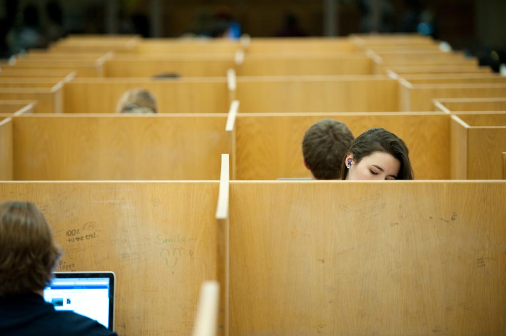 Clemons Library boasts three floors for study and an extensive media library, plus it’s almost always open. When classes are in session, starting every Sunday at 10 a.m., the library stays open 24 hours a day until Friday at midnight. Upon entering, students mill about, talking with friends in the booths looking out onto the courtyard, or work together at one of the stations equipped with monitors, power outlets and rolling chairs. The lower floors of Clemons are quieter. On the first floor, the silence is testament to the concentration that goes into prolonged effort.