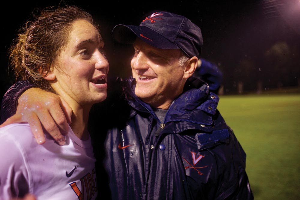 Head coach Steve Swanson hugs midfielder Morgan Brian after her golden goal against the Fighting Irish, leaving the Cavs as the only unbeaten Division I women’s college soccer team in the nation.