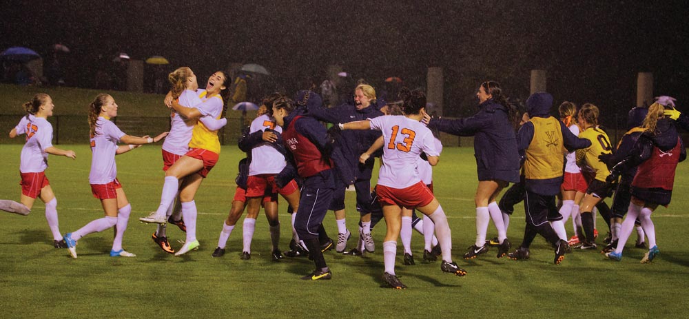 These photos capture moments from a fierce, double-overtime victory against No. 5 Notre Dame at Klöckner Stadium in October. Nearly 3,000 fans—at the time, the largest crowd to watch a UVA women’s soccer game—endured a drenching rainstorm to cheer on the team. The attendance record was broken again a few weeks later, when close to 4,000 fans watched the team defeat No. 3 Florida State, clinching its first ACC regular-season title.