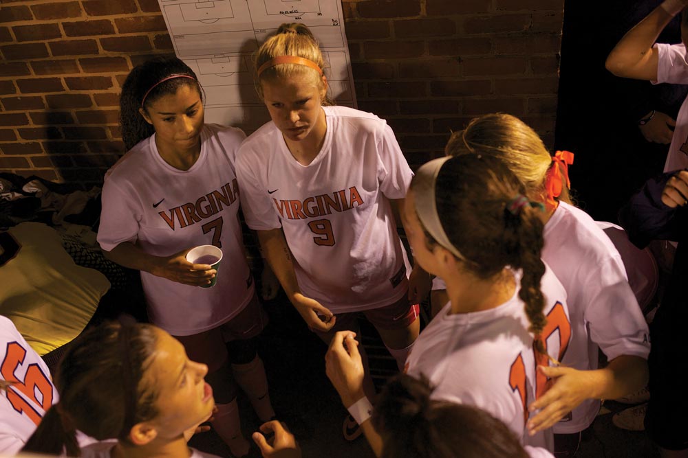 The mood was upbeat and optimistic as UVA women’s soccer players Gloria Douglas (7) left and Makenzy Doniak (9) talked strategy with teammates before the start of their match against Notre Dame.