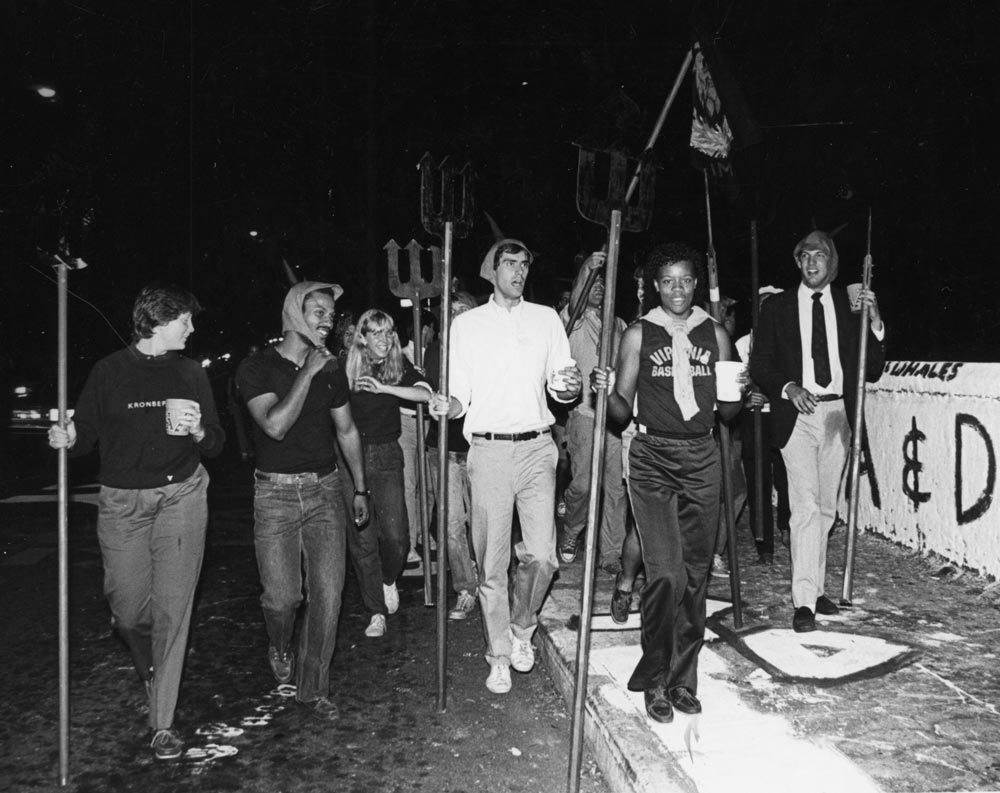 History: Dedication to preservation of traditions has occasionally sparked controversy. In 1982, the Purple Shadows broke into the office of Dean of Students Robert Canevari and left a purple-inked letter that expressed disagreement with the decision to cancel Easters. Not amused, Canevari filed Judiciary Committee charges against the group that, according to a Cavalier Daily article, had “tweaked the University’s whiskers by daringly delivering its opinions to students, faculty and administrators.”