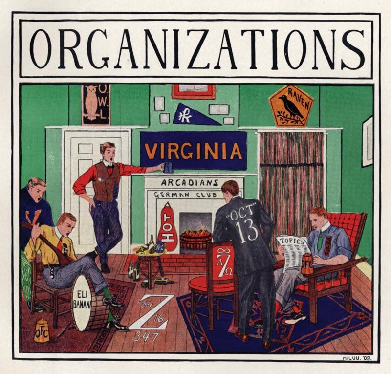 Most of the student organizations that formed in the late 19th century were organized without any attempts to keep their membership hidden. A quartet of ribbon societies—Eli Banana, T.I.L.K.A., the Thirteen Club and the Zeta Society—so named for the ribbons its members pinned to their lapels—were among the most prominent and influential student organizations on Grounds.