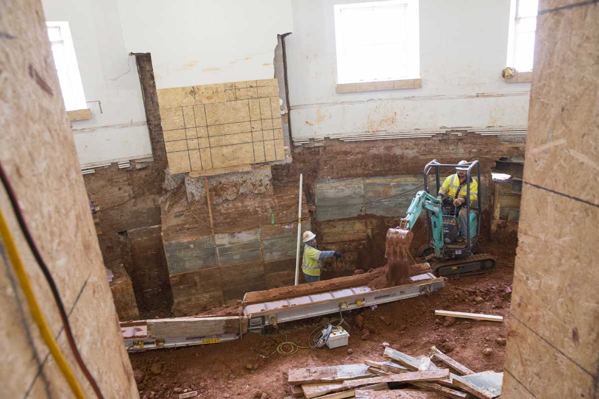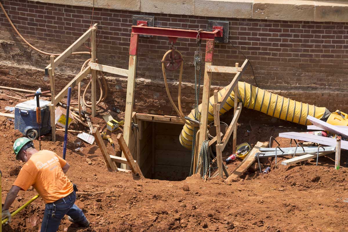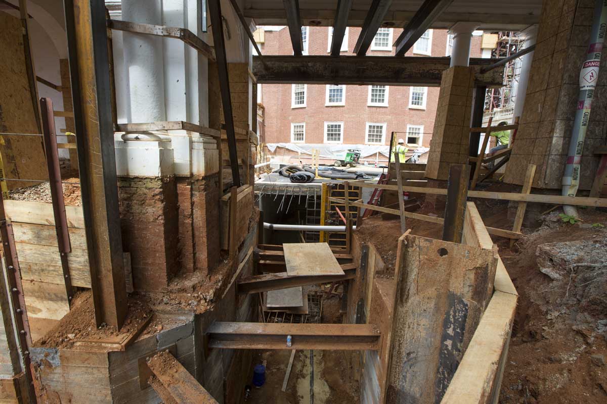 Repairing the Rotunda’s foundation and underpinning was a huge undertaking that occupied the first six months of the second phase of the restoration. The Rotunda was built directly on the ground, with no foundation, so the excavation had to be done in the old-fashioned way: with shovels and muscle.