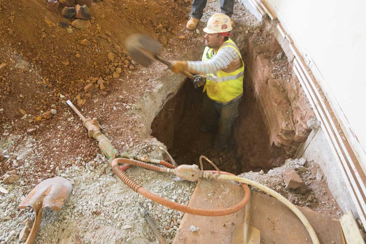 Workers dug small pits—about 3 feet by 4 feet—under the building. Once a pit was dug, it was filled with concrete; workers then moved about 10 feet down the line and dug and filled another pit, and so on. They dug close to 100 pits to help support the building.