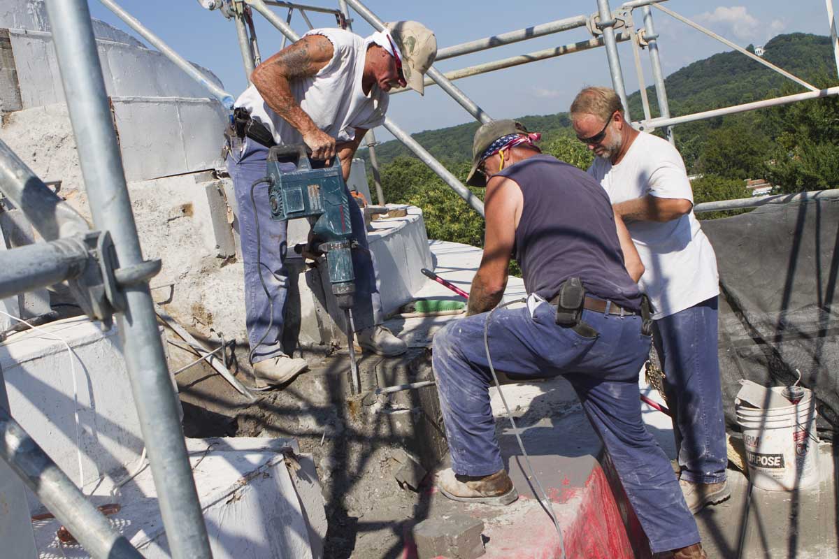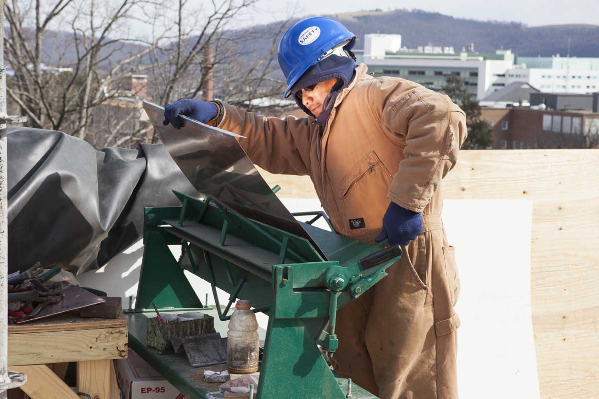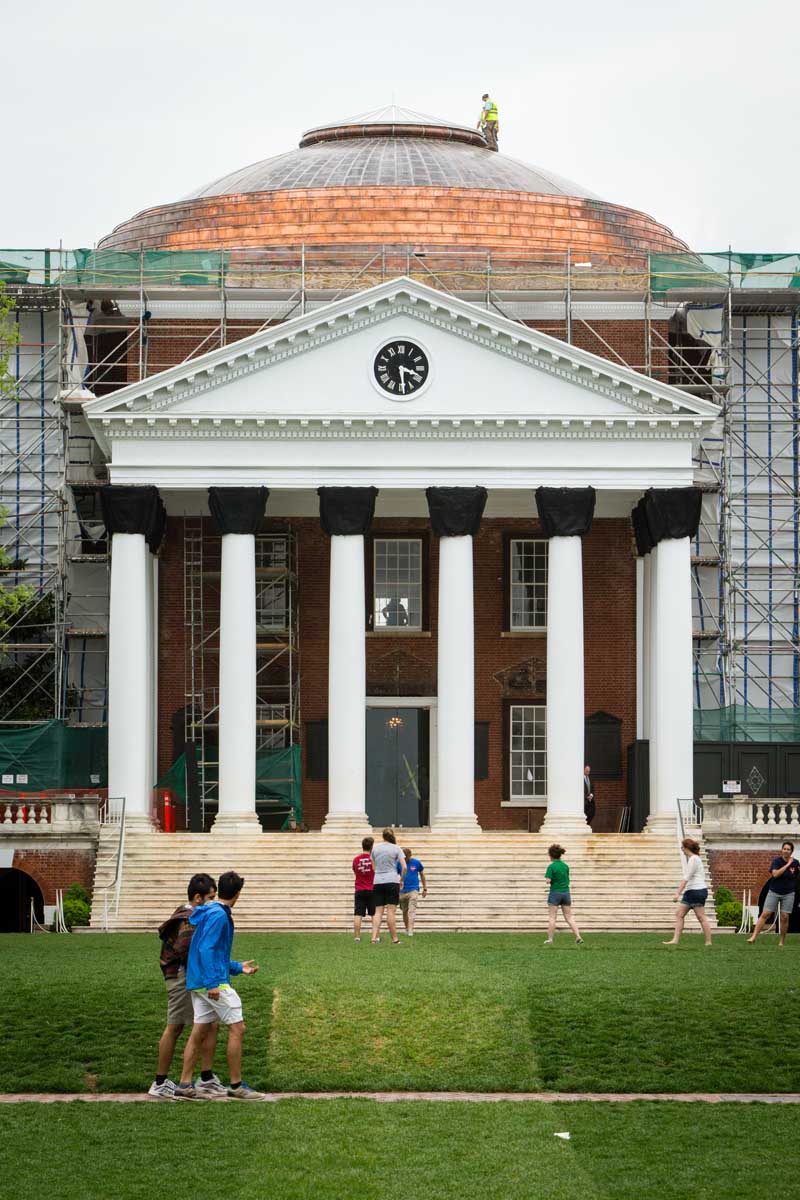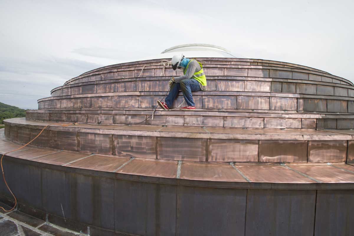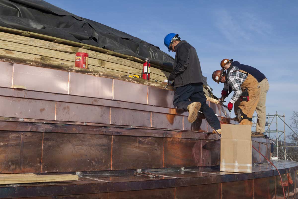 During the recent renovation, roofers from W.A. Lynch Roofing Co. of Charlottesville replaced the steel roofing with white-painted copper roofing, as White intended in 1898. They applied more than 4,000 pieces of copper, weighing a total of six tons, to the steep-sloped, stepped dome.