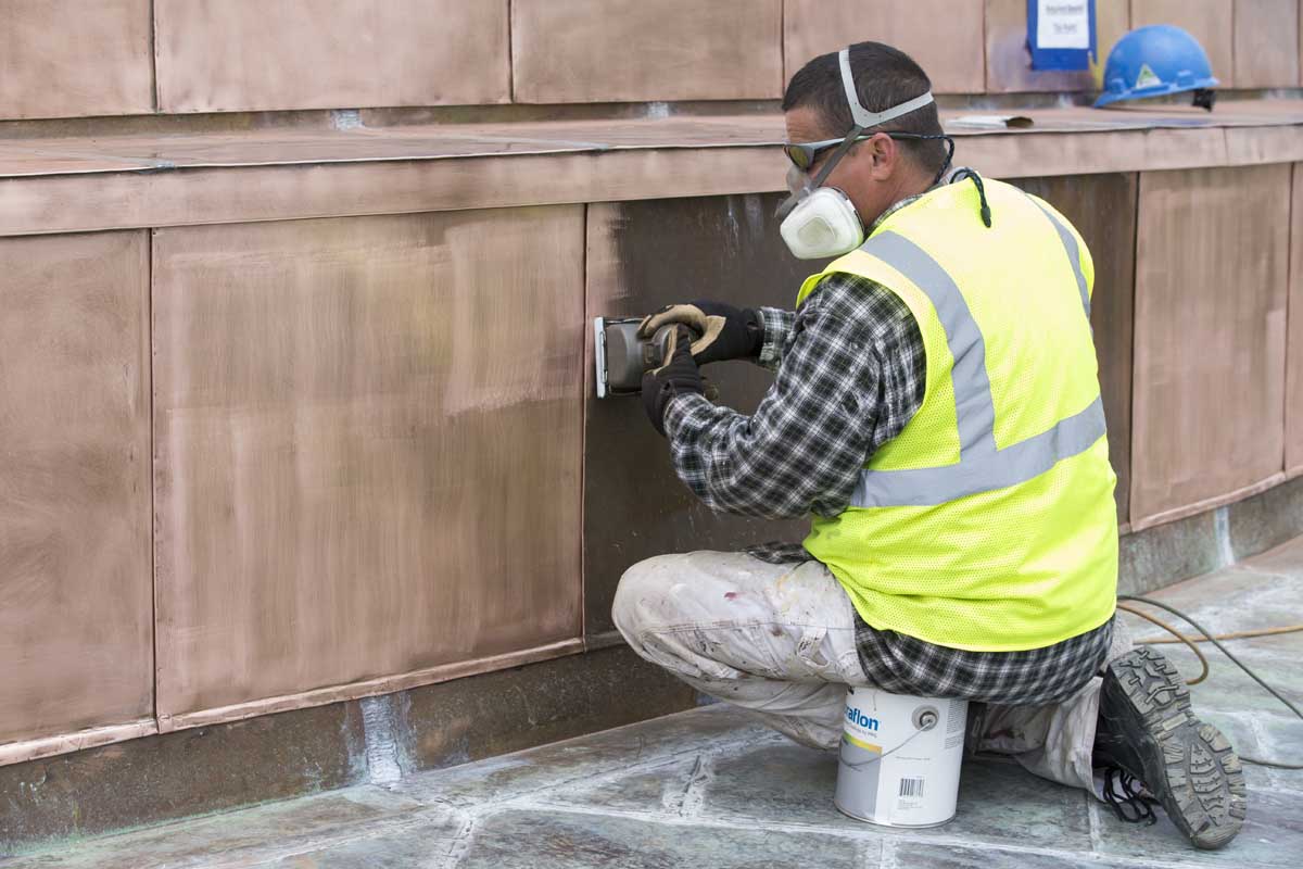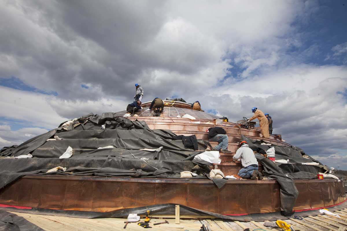 Painting the roof was no small task. The prepping, priming and painting could be completed only in absolutely dry conditions in temperatures ranging from 60 to 100 degrees Fahrenheit and 5 degrees above the dew point. After lightly sanding the copper and applying a primer coat, painters E. Caligari & Son of Norfolk tackled the painting in sections, starting with the top of the dome and moving down. The paint job is expected to last 20 to 30 years. And no one expects the roof to leak any time soon.